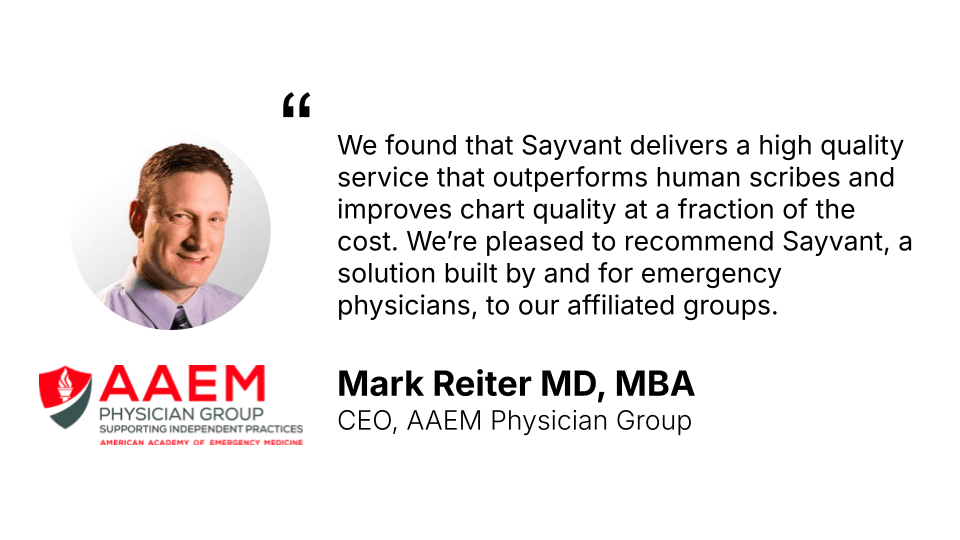 <h1 dir="auto">American Academy of Emergency Medicine Physician Group (AAEM-PG) Names Sayvant a Preferred Clinical Documentation AI Vendor</h1><p dir="auto">Partnership will streamline emergency-department documentation, strengthen charge capture, and give clinicians more time for patient care.</p><p dir="auto">May 20, 2025 — Sayvant, the leading clinical AI solution for acute care, today announced its designation as a preferred vendor for the American Academy of Emergency Medicine Physician Group (AAEM-PG). The selection follows a competitive evaluation and highlights AAEM-PG\'s commitment to elevating care quality, clinician experience, and revenue-cycle performance across its national network of independent emergency medicine groups.</p><p dir="auto">"Emergency clinicians work at an unforgiving pace," said Justin Mardjuki, CEO of Sayvant. "By entrusting documentation to Sayvant, AAEM-PG\'s groups will improve shift quality, strengthen documentation clarity, and capture full reimbursement capture for care delivered."</p><p dir="auto">Andrew Napier, MD FAAEM, Sayvant co-founder and board-certified emergency physician, said, "Clinical notes drive every downstream decision in emergency medicine. Sayvant makes every note robust, defensible, and aligned with RCM, Risk, and Quality requirements while freeing physicians from the keyboard. We built Sayvant to support AAEM\'s mission of helping democratic emergency groups deliver evidence-based, patient-first care."</p><p dir="auto">Mark Reiter, MD, MBA, CEO of AAEM Physician Group, said, "AI documentation is top of mind for our groups, and we have evaluated numerous options. We found that Sayvant delivers a high quality service that outperforms human scribes and improves chart quality at a fraction of the cost. We\'re pleased to recommend Sayvant, a solution built by and for emergency physicians, to our affiliated groups."</p><p dir="auto">Sayvant transcribes clinician-patient interactions, provides real-time access to approved standards of care, and generates clinically defensible Emergency Medicine charts, ensuring alignment with Quality, Risk, and Revenue Cycle requirements. Emergency Medicine groups using Sayvant report:</p><ul dir="auto"><li data-preset-tag="p"><p>3% lift in appropriate charge capture</p></li><li data-preset-tag="p"><p>7% improvement in Time to Provider, 3% improvement in turn-around time to admission (TAT-D) and to discharge (TAT-D)</p></li><li data-preset-tag="p"><p>Up to 80% reduction in charting time per encounter</p></li></ul><p dir="auto">(*Averaged results across 50+ emergency sites)</p><p dir="auto">AAEM-PG members can reach the Sayvant team at <a href="mailto:hello@sayvant.com">hello@sayvant.com</a>. Please include AAEM-PG in the subject of your email for access to AAEM-PG specific onboarding benefits and discounts.</p><p dir="auto">About AAEM Physician Group</p><p dir="auto">AAEM-PG offers empowers local, independent, democratic emergency physician groups to meet their full potential. Our member groups practice in a setting based on fairness and transparency where each physician is an owner. AAEM believes physician groups comprised of local physician owners provide the highest level of care and are most invested in the long-term success of their hospital partners and community. AAEM-PG can also assist in the formation of new emergency medicine groups.</p><p dir="auto">About Sayvant</p><p dir="auto">Sayvant is the leader in clinical documentation AI for acute care. Sayvant automates the creation of robust, clinically accurate charts, saving Emergency Medicine clinicians 2+ hours a day while improving RCM, Risk, and Quality outcomes. To learn more, visit sayvant.com or email us at <a href="mailto:hello@sayvant.com">hello@sayvant.com</a>.</p>